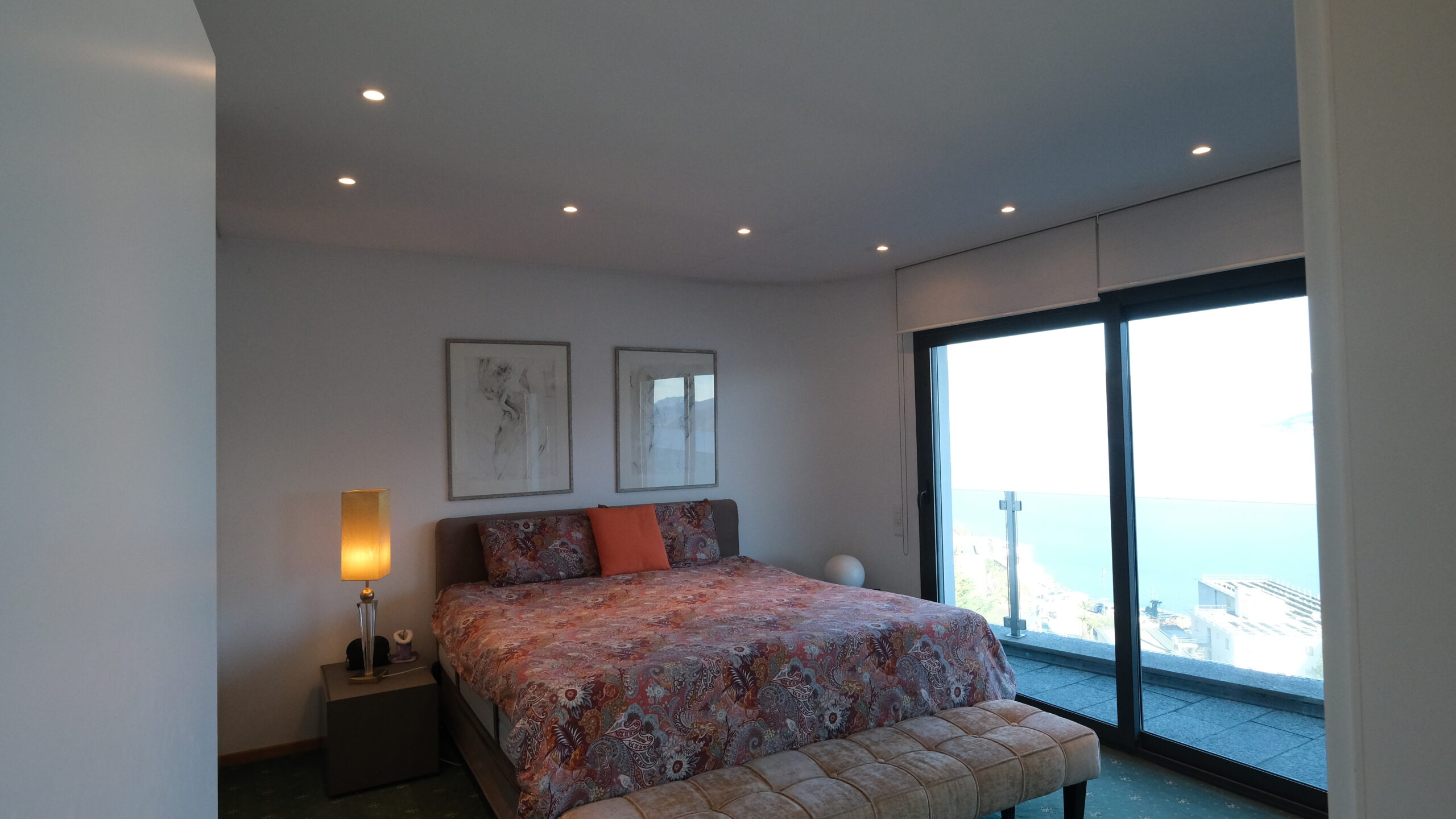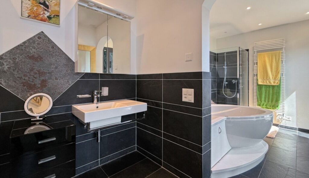 Eines der vier stilvoll ausgestatteten Badezimmer bietet höchsten Komfort und eine elegante Wohlfühlatmosphäre. Die großzügige Eckbadewanne und die moderne Dusche ermöglichen entspannte Wellnessmomente – ergänzt durch einen wunderschönen Blick auf den See. Zwei große Waschbecken schaffen zusätzlichen Komfort und machen diesen Raum ideal für Paare oder Familien. Die hochwertige Ausstattung und das durchdachte Design unterstreichen den exklusiven Charakter des Objekts.