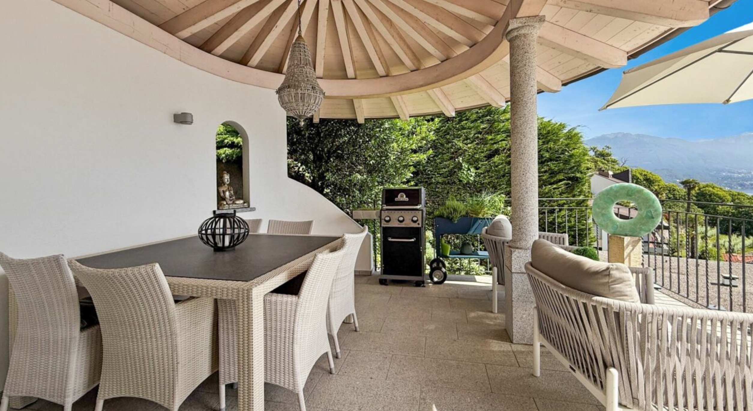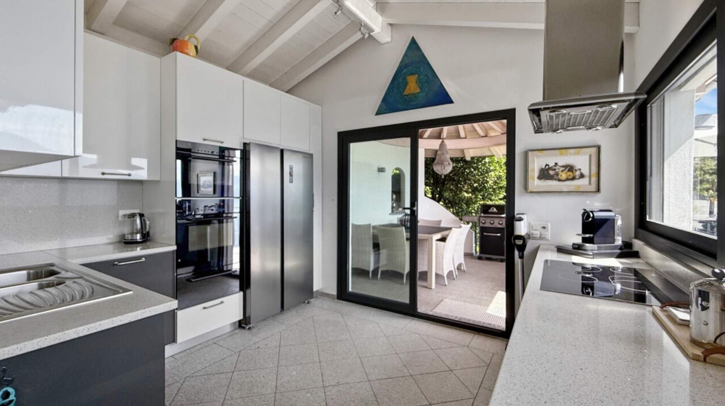 Die elegante, lichtdurchflutete Küche bietet hochwertige Geräte, großzügige Arbeitsflächen und viel Stauraum. Glänzende Fronten, ein großes Side-by-Side-Kühlsystem, moderne Einbaubacköfen und ein Induktionskochfeld sorgen für höchsten Komfort. Durch die Glasschiebetür gelangt man direkt auf die überdachte Terrasse – ideal für Kochen und Genießen im Innen- und Außenbereich.